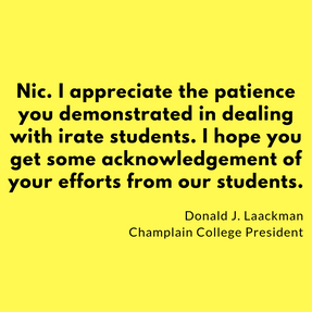 Received Champlain College David J. Provost Culture of Wellbeing Award. This award recognizes the individual(s) who exemplifies the spirit, enthusiasm, and commitment modeled by David J. Provost in supporting Champlain College Wellbeing.